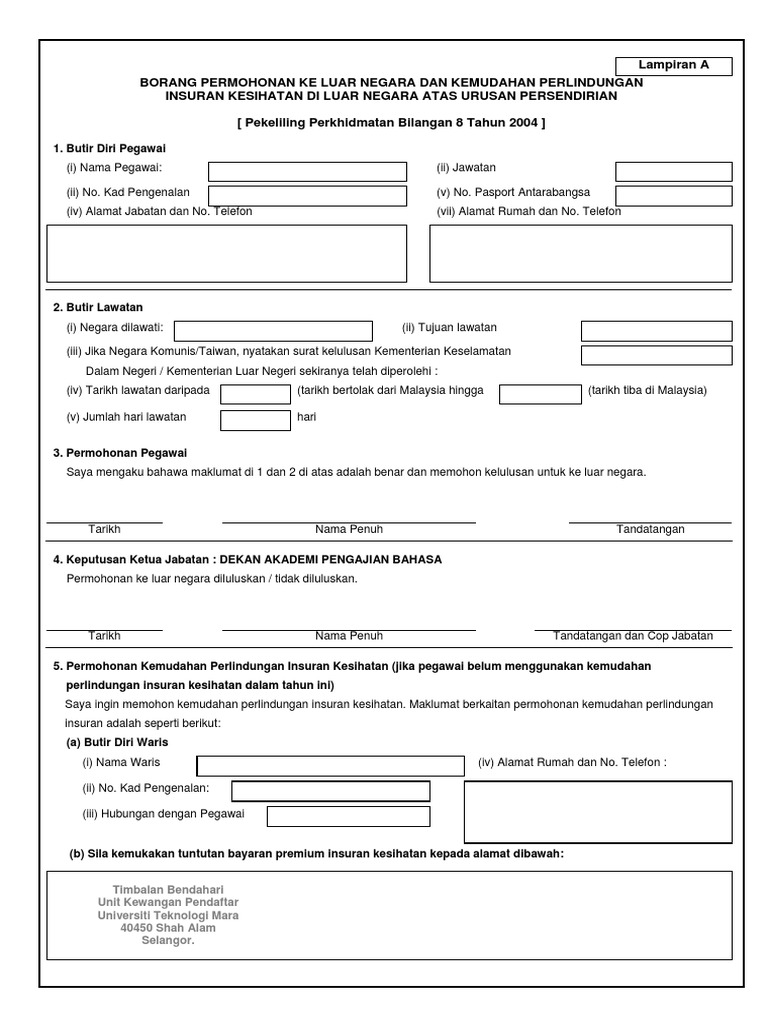 Borang permohonan keluar negeri yang di tandatangani oleh ppid. Garis panduan permohonan perjalanan pegawai awam ke luar negara urusan persendirian 2019 ii. Sebarang pertanyaan, sila berhubung dengan urusetia keluar negara. Borang permohonan keluar negeri (urusan rasmi). Maklumat perjalanan ke luar negara.
