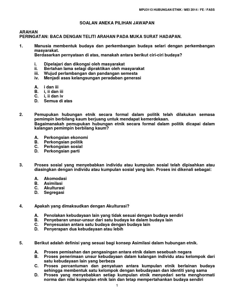 Contoh soalan hubungan etnik & jawapan mpu 3113 hubungan etnik peperiksaan akhir semester bahagian soalan objektif (40 markah) arahan: Contoh soalan hubungan etnik dan jawapan scribd. Berikut yang manakah benar mengenai tujuan dasar tersebut? Garis lurus soalan dan jawapan. Kepentingan persoalan hubungan etnik, perpaduan dan integrasi bagi mewujudkan kestabilan negara tun razak: